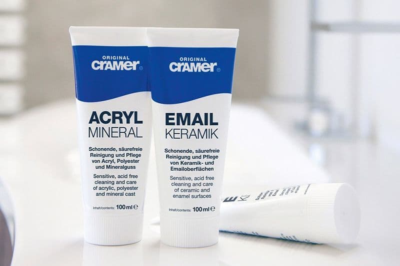 Proper cleaning and care of the bathroom can be quite challenging. Occasionally it is difficult to keep track of how to clean a bathtub made of enamel, an acrylic shower tray or a wash basin made of mineral cast – even for professionals. Commercial detergents only reveal in the small print the damage that may occur when applied on various sanitary surfaces. There is no gentle yet thorough “all purpose cleaner” on the market. Update your customers on how to correctly clean and maintain their high-quality bathroom equipment today. The Cramer cleaning and care product series, sold and recommended by sanitary professionals – a service the customers will certainly appreciate!