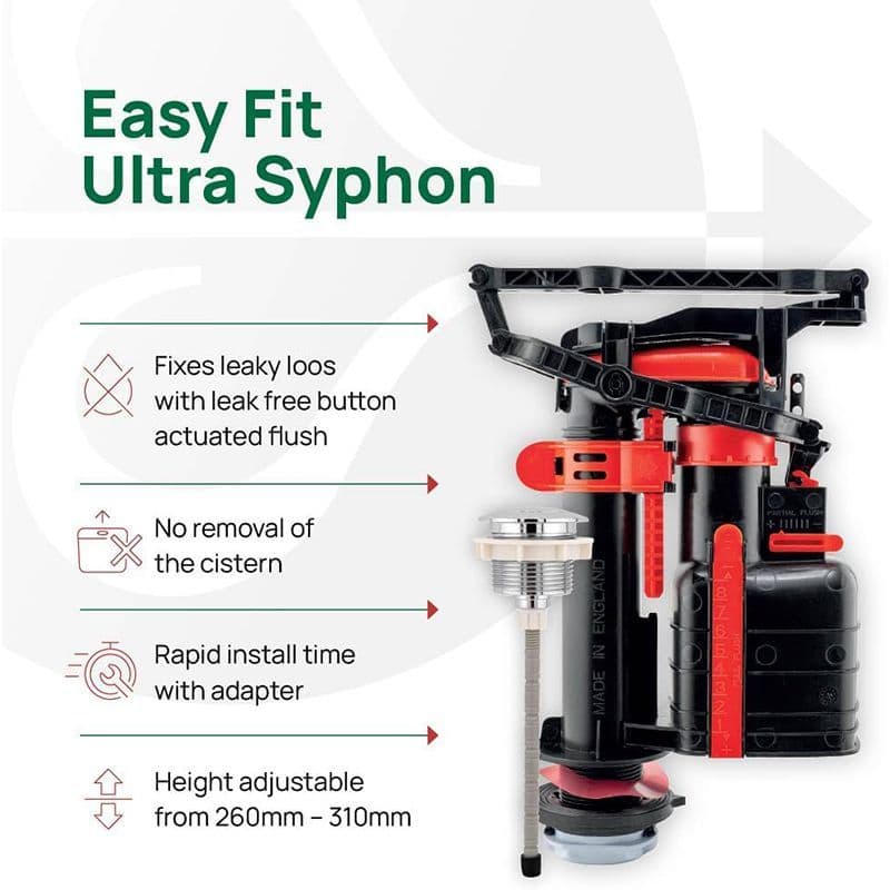 Leaking WCs in the UK contribute to as much as 400 Million litres of water wasted daily. If your toilets flush valve is constantly leaking water, you could be wasting water equivalent to flushing as many as 50 to 100 times every single day. Not only is this bad for the environment, it adds extra cost to your water bill! The Fluidmaster Easy Fit Ultra Syphon offers a leak free solution, compatible with modern toilet cisterns.